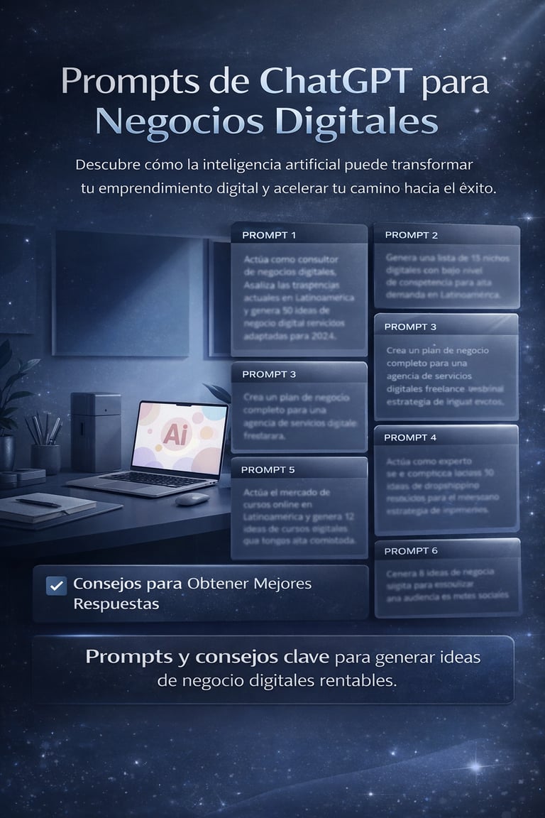 Una guía práctica para transformar ideas en negocios digitales rentables. Con 20 prompts estratégicos, aprenderás a generar ideas de negocio, validar oportunidades, crear propuestas de valor y estructurar tu proyecto online con la ayuda de la inteligencia artificial. Perfecto para quienes quieren comenzar o escalar su negocio digital.